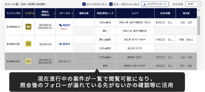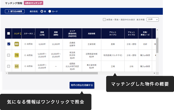 物件・ニーズ情報を登録後、1時間程度でマッチング状況がスコアと合わせて一覧表示。