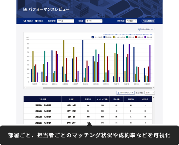 管理者機能として自社利用者毎の登録件数や照会・商談件数等の情報が一覧化。