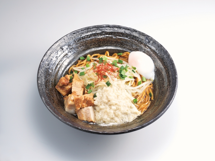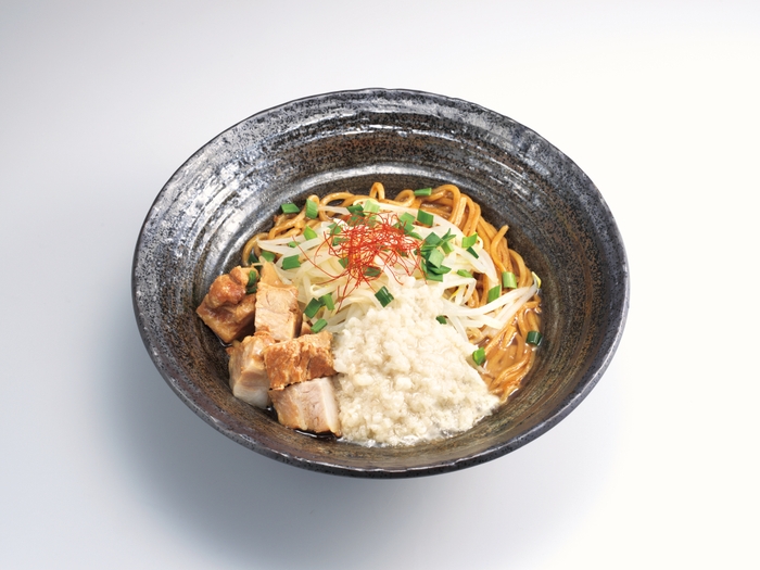 八丁味噌とたまり醤油による発行調味料の深みに、自家製にんにく油のパンチと背脂の甘みが合わさって、くせになる味わいに仕上げています。ニンニクとニラがガツンと効いたスタミナ満点なまぜそばです。辛いものが苦手な方にはこちらのまぜそばがおすすめです。