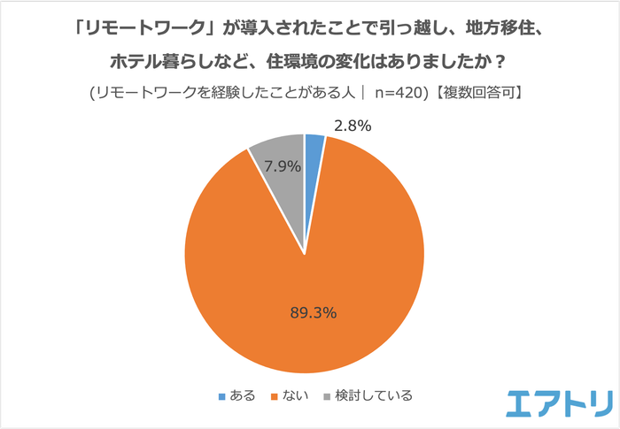 リモートワークを経験している人の中で、住環境の変化があったかを聞いたところ「ない」と回答した人が 89.3%、「ある」が2.8%、「検討している」は7.9%といった結果になりました。実際に住環境の変化があった人は1 割以下にとどまりました。