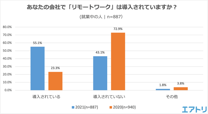 就業中の人に対し、勤務先でリモートワークが導入されているか聞いたところ、「導入されている」と回答したのは半数を超え、昨年の結果と比較してみると31.8ポイントも増加しており大幅に増加したことがわかりました。