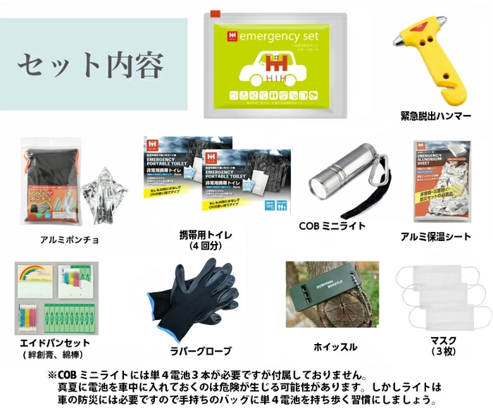 水害や雪害の渋滞などで車内で足止めされた際に役立つ脱出ハンマー、トイレ処理セット、アルミブランケット、ライトなどをコンパクトに収納。車のドアポケットやグローブボックスにも収まるサイズで、運転の邪魔になりません。