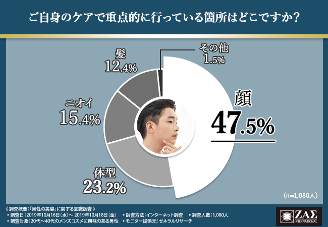 そこで、「ご自身のケアで重点的に行っている箇所はどこですか?」と質問したところ、「顔」という回答が最も多く、次いで「体型」 、「ニオイ」 、「髪」 と続きました。