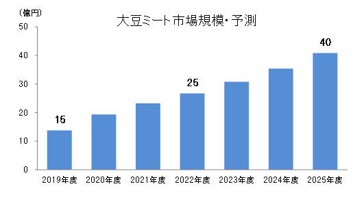 健康志向の高まりを受け、“低カロリー・低脂質・高たんぱく”という特徴から注目を集めている大豆ミート。家畜の飼育・食肉の生産は環境に悪影響を及ぼすとされ、環境への配慮から大豆ミートを購入する消費者も増えています。大豆ミートの国内市場は、2020年度の20億円に対し、2025年度は2倍の40億円に拡大すると予想されています。