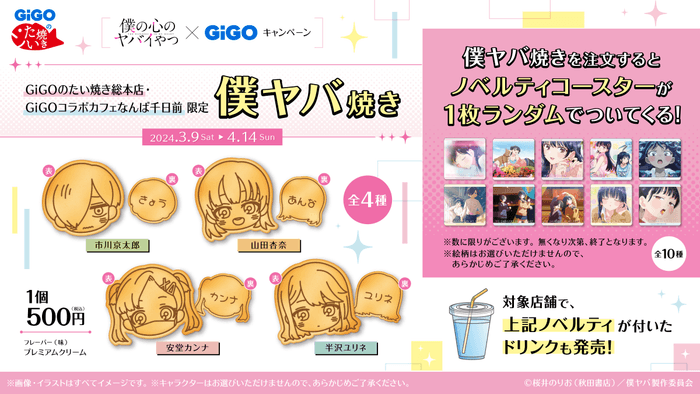 GiGOのたい焼きにて、僕の心のヤバイやつに登場する 「市川京太郎」・「山田杏奈」・「半沢ユリネ」・「安堂カンナ」が可愛らしいたい焼きになります。