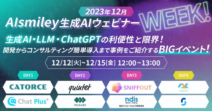 題して、AIsmiley生成AIウェビナーWEEK!生成AI・LLM・ChatGPTの利便性と限界!開発からコンサルティング簡単導入まで事例をご紹介するBIGイベント! 4日間にわたり様々テーマで生成AIウェビナーを実施いたします。