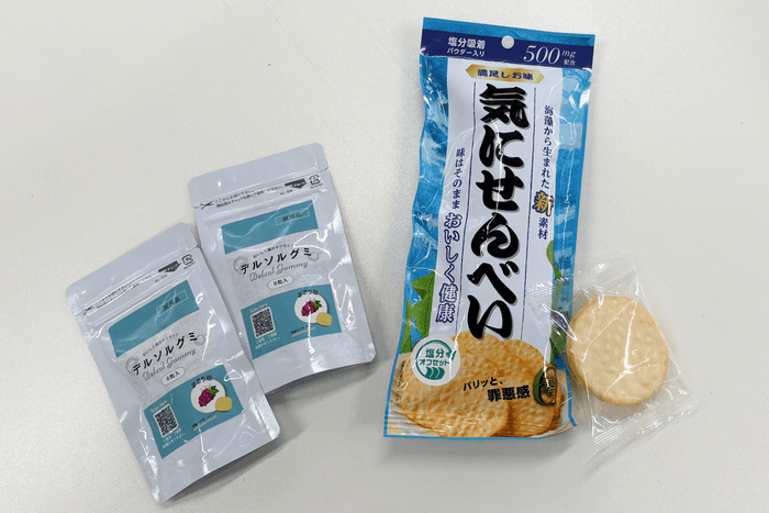 今回のイベントでは、当社の技術を応用した商品として、通常の塩味はそのままに、塩分吸着パウダーと称したアルギン酸類の働きで実質的に塩分がゼロになるよう設計された「煎餅」や、アルギン酸類を配合しデザート感覚で食事の塩分をオフセットする「グミ」を来場者に紹介しました。