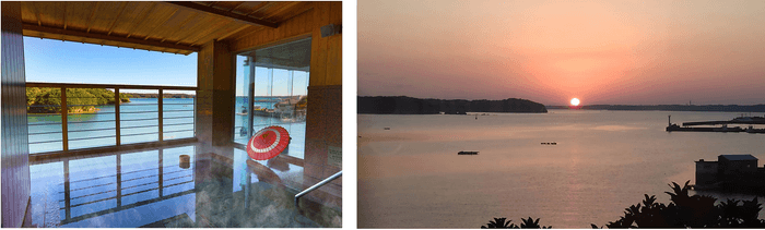 南紀串本の眼前に広がる太平洋を雄大とするなら、伊勢志摩の目の前に広がる英虞湾は正に「風光明媚」という言葉がぴったり。日本有数のリアス式海岸が作る湾の中、日中は行き交う小さな漁船を、夜は星を眺めながら、静謐のひと時をお楽しみいただけます。こちらもお薦めは早朝の入浴。群青色から薄紫に変わる空と、海の上に光の道を作りながら昇る朝日を眺める、非日常の朝風呂がお楽しみいただけます。