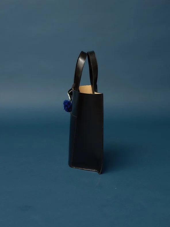 真っ黒なガラスレザーを使い、柔らかなカーブと直線をBAG全体で表現したNAVY.WO のトートバッグ。
