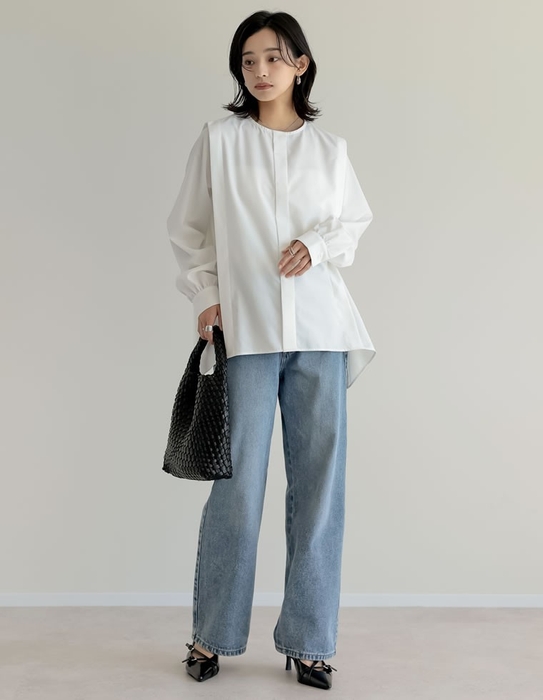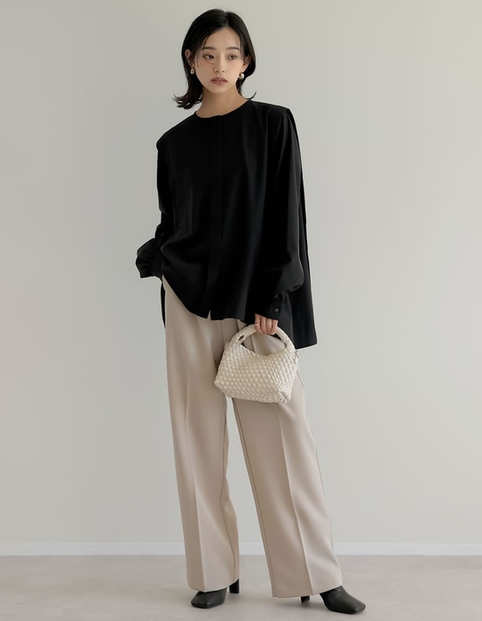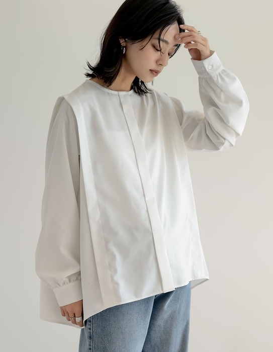 程よくゆとりのあるサイズ感ですが、スタイル良く見えるタックの入れ方や、きれいめに着こなせるネックデザインに注目。