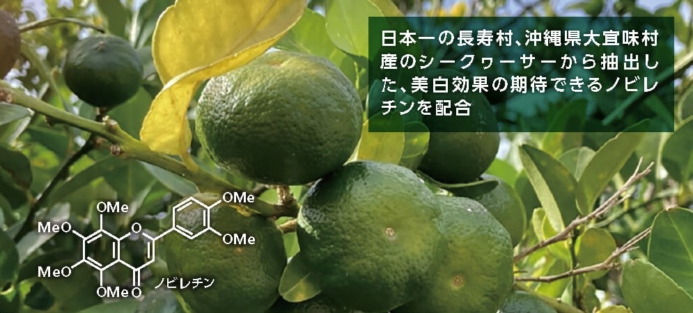 1、大宜味村産シークヮーサーから抽出した琉球大学の特許成分「ノビレチン※」をたっぷり配合 (※琉球大学 特許2014-540773号)