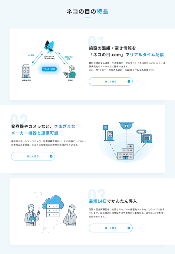 当社の運営する混雑・空き情報をポータルサイト「ネコの目.com」や連携実績のあるハードウェア、連携の流れを3つの特長としてご紹介しています。