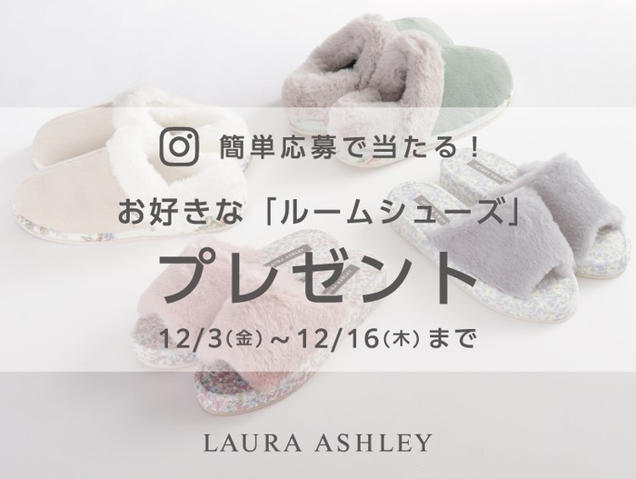 12月3日(金)~12月16日(木)の期間中、LAURA ASHLEY 公式ショップInstagram(@lauraashley_official_shop)にて、おうち時間を暖かくお過ごしいただけるルームシューズが当たるキャンペーンを開催!キャンペーンの詳しい情報はこちらまで→ https://store.world.co.jp/s/brand/lauraashley/news/035927/