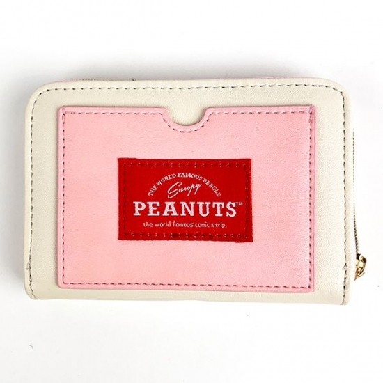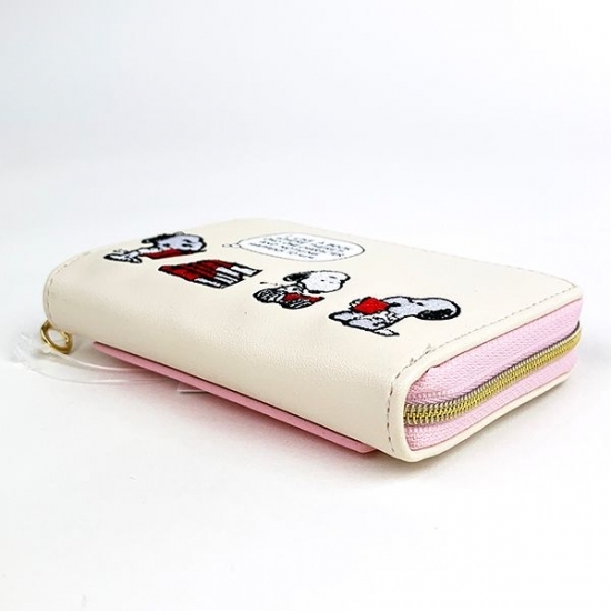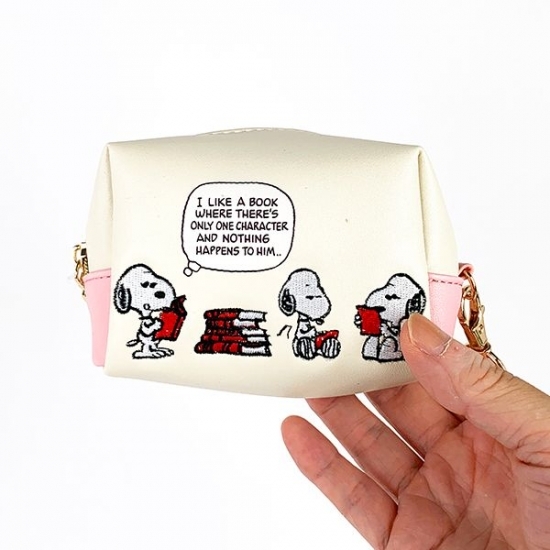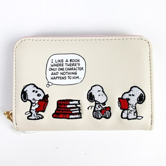 ベージュの背景に本を読むスヌーピーの刺繍がデザインされた、とってもかわいいお財布です。