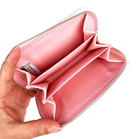 ファスナーを開くと、3つに仕切られたポケットがあります。コインごとに仕分けもできますし、折りたたんだお札を入れることもできますね。