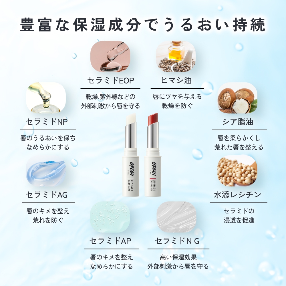 本製品は、唇の乾燥や荒れを防ぎながら、自然な仕上がりで清潔感と好印象をさりげなく演出する高保湿リップです。
