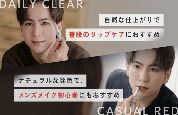 カラーは、誰もが使いやすい無色タイプ(DAILY CLEAR)と自然な色味で血色を良く見せる※色付きタイプ(CASUAL RED)の2色展開になります。