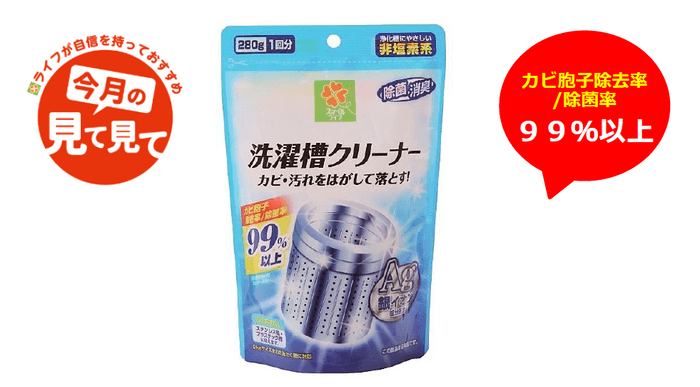 気温・湿度が高くなり、汗・皮脂汚れがついた衣服の洗濯が多くなる季節。栄養となる衣服の汚れが洗濯槽に残るとカビが発生しやすくなります。洗濯槽のカビ・汚れが気になる方に、ライフが自信を持っておすすめする「今月の見て見て」の近畿圏7月商品に選ばれた「洗濯槽クリーナー」は、洗濯槽の汚れを分解し、99%以上のカビ胞子除去率/除菌率で、銀イオンによる消臭も可能にしました。洗濯槽を綺麗に保つためのお手入れにぴったりな「洗濯槽クリーナー」はライフ店舗にて販売しております。