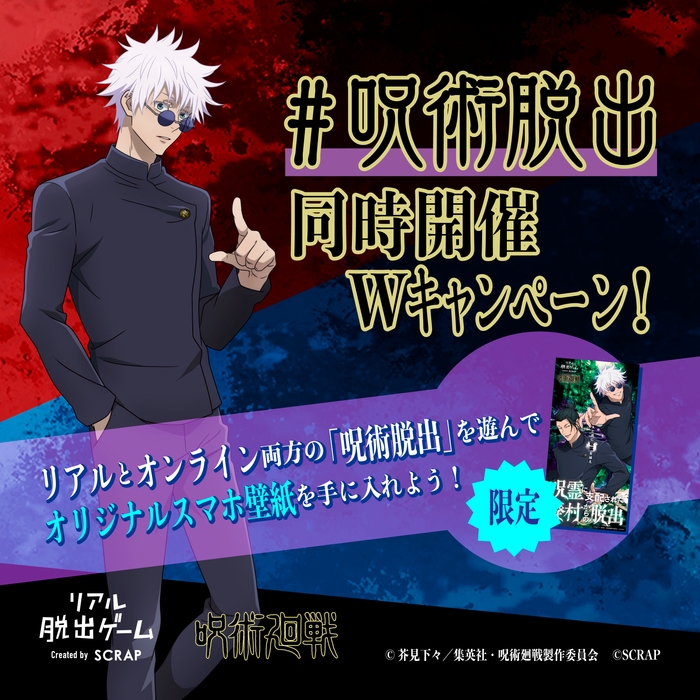 また、コラボ最新作のスタートと今回の再販を記念して「#呪術脱出 同時開催Wキャンペーン!」の実施も決定! リアル会場でのイベント『呪霊に支配された廃村からの脱出』とオンラインで遊べる『呪霊棲まう廃校からの脱出』、両方の「呪術脱出」を遊ぶと、オリジナルスマホ壁紙を手に入れることができます。描き下ろしビジュアルがデザインされたここでしか手に入らないスマホ壁紙は「呪術廻戦」ファン必見。ぜひ2つの「呪術脱出」を体験して手に入れてください!