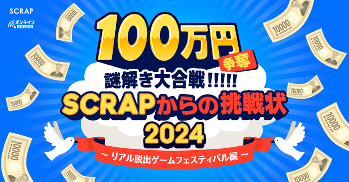 リアル脱出ゲームフェスティバル開催記念! 大人気企画『SCRAPからの挑戦状』(通称「100万謎」)が登場。「100万謎」とは、謎解きに答えて正解すると正解者の中から抽選で総額100万円が当たる、無料で挑戦可能なWEB謎解きです。出題開始は7月を予定! (詳細は後日発表) 『リアル脱出ゲームフェスティバル』では、最速で「100万謎2024」の解説と抽選を行います。今年も、解きごたえ十分の謎と抽選で当たる総額100万円をご用意しました。そして謎解き自体は最後まで無料で挑戦可能! フェスまでの腕試し、運試しで、謎解きに挑戦し、最速生解説をお楽しみください。