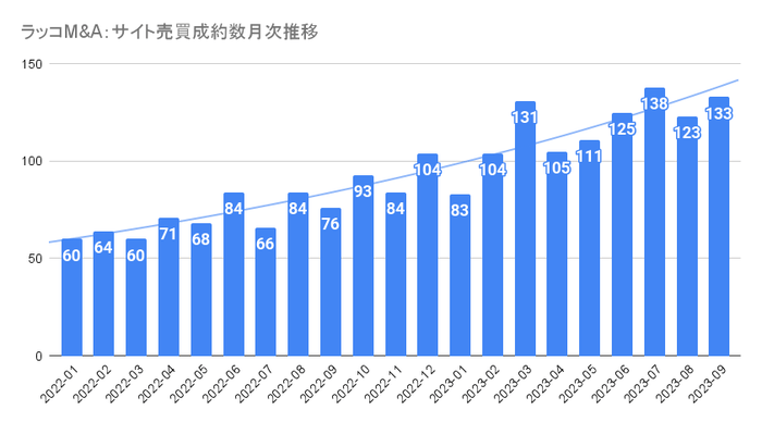 ラッコ株式会社(東京都渋谷区)が運営するサイト売買プラットフォーム『ラッコM&A』は、2023年第3四半期(2023年7月〜9月)のサイト売買成約金額が3億円を突破しました。成約数は、過去最多の394件を記録しています。