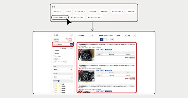 クリックしたハッシュタグと関連性の高い商品を一覧表示することで、ユーザーは類似商品を比較検討しながら目的の商品を見つけることができ、サイトの利便性向上に繋がります。