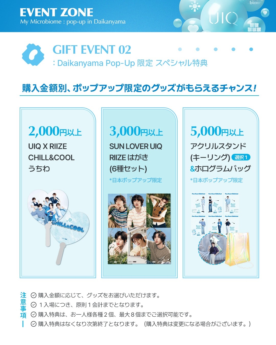 ポップアップストア開催を記念して、購入商品や購入金額に応じたプレゼントイベントのほか、フォロー&投稿イベントなど多彩な企画を実施いたします。ポップアップストアにご来場いただいたすべての方がご参加いただけます。また、特別展示としてUIQアンバサダー「RIIZE」の展示ゾーン*¹もご用意しておりますので、ぜひこの特別なイベントをお楽しみください。