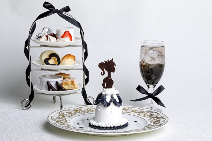 アシェットデセールには推しカラーをあしらったプリンセスイメージのドレスケーキ、ミニ三段スイーツスタンドにはプリンセスティアラ付きのモンブランやノエルガトーショコラ、推しカラーのハートアイシングクッキー、ヒールチョコなどのプチガトーとセイボリーをご用意しています。