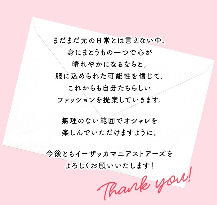 イーザッカマニアストアーズはこの度、オンラインの便利な部分はもっと便利で快適に、不安な部分は少しでも取りのぞいて安心してお買い物いただけるように、なによりも「お買い物すること」「洋服を着ること」をもっと楽しんでいただけるように、イーザッカマニアストアーズ本店サイトを全面リニューアルいたしました。