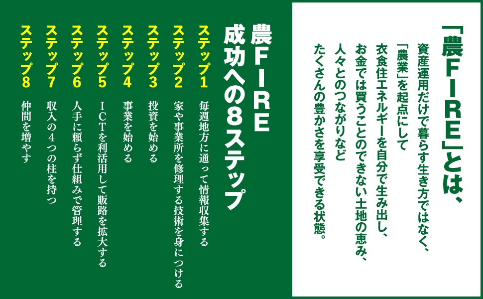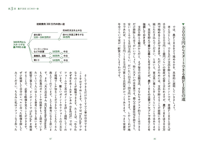 本書では、「農業なんて自分にはできそうにない」「いきなり地方に移住するのはハードルが高い」「資金をすぐには準備できない」などといった読者の不安や疑問を解消しつつ、成功をあせらず、失敗しないよう「農FIRE」を進めるポイントをていねいに説明。