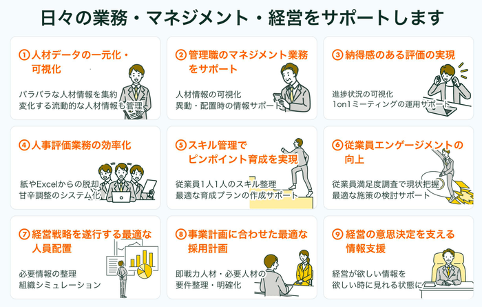 組織内に分散しがちな人材情報や目標を一元管理して見える化し、従業員の経歴やスキルを瞬時に把握できます。また、人材育成や人材配置、目標の設定、採用計画、人事制度運用の効率化、離職防止などをさまざまな機能でサポートします。