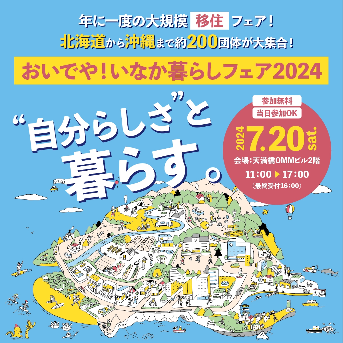 「おいでや!いなか暮らしフェア」は、全国各地の市町・団体が、移住を希望している人・興味のある人に対して、新しい暮らし方の提案や地域の紹介、移住に関する相談対応などを行う、移住マッチングイベントです。