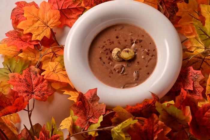 『栗と木ノ子のポタージュスープ』は、栗と木ノ子の濃厚なコクと甘さが特徴のトロっとしたスープです。隠し味に使用している玉ねぎは淡路島産の甘味が強いものを使用し、木ノ子と栗の素材本来の味を引き立てます。