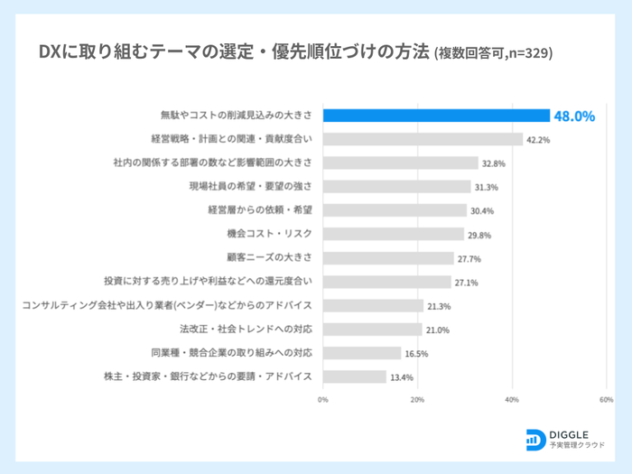 ・DXに取り組むテーマの選定・優先順位づけの方法で、もっとも多い回答は「無駄やコストの削減見込みの大きさ(48.0%)」であった。