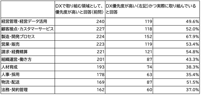 「経営管理・経営データ活用」領域のDXの優先度が高いと回答し、かつ実際にDXに取り組んでいると回答した方は半数以下の49.6%であった。優先度が高いと考えている企業でも、実際の取り組みまでは行えていない企業が50.4%いる結果となった。