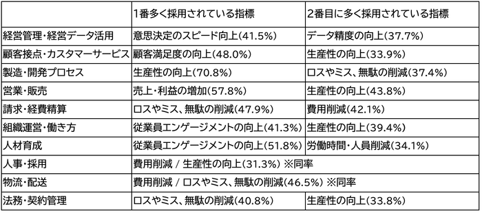 各領域でもっとも採用されているDXの成果指標は以下の通り。