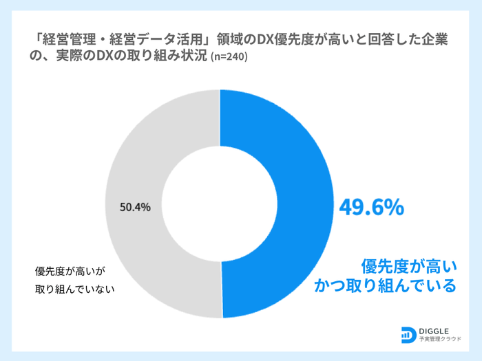 ・「経営管理・経営データ活用」領域のDX優先度が高いと考える企業の中で、実際にDXに取り組んでいる企業は半数以下となる49.6%であった。