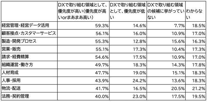 上記10テーマそれぞれに対し、所属企業におけるDXの優先度合いを聞いたところ、「経営管理・経営データ活用」領域については59.3%の担当者が優先度が高い(高いorまあまあ高い)と回答。10テーマの中でもっともDXの優先度が高い結果となった。