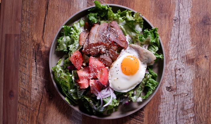 肉々しいパティの上には店内でスモークしたベーコンが2枚。