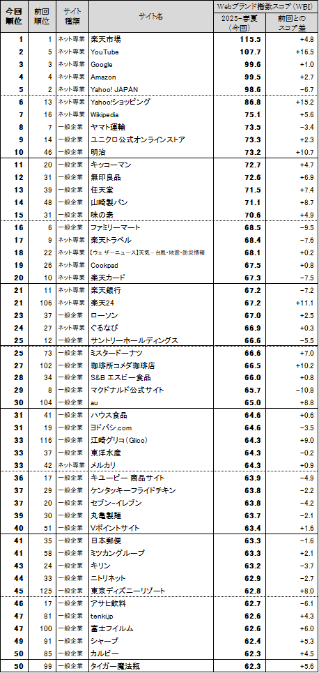日経BPコンサルティング調べ「Webブランド調査2025-春夏」 Webサイトのブランド力、総合編は 「楽天市場」が3回連続で首位を獲得 一般企業サイト編のトップ3は、「ヤマト運輸」 「ユニクロ公式オンラインストア」「明治」