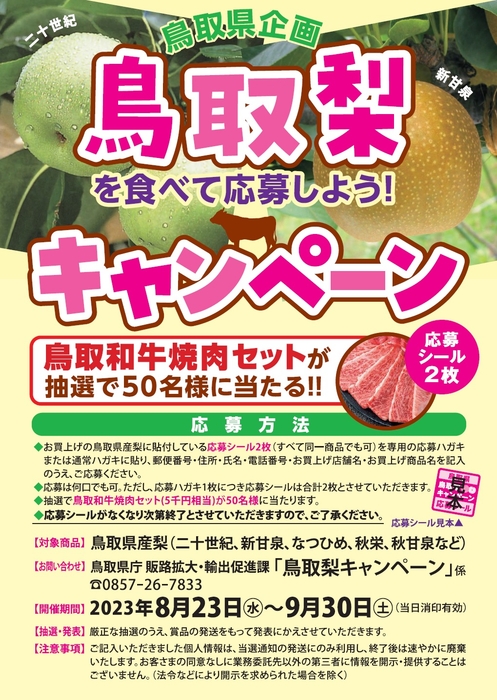 開催内容:専用はがきに応募シールを2枚貼りご応募いただくと、鳥取和牛焼肉セットを抽選で50名様にプレゼント!(お買い上げいただいた梨1個につき応募シール1枚。)