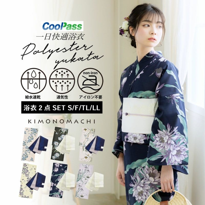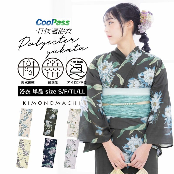 暑い真夏でも過ごしやすいように、浴衣素材には吸水速乾ポリエステル「CoolPass」を採用。