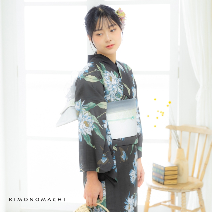 原産地ではコウモリが花に引き寄せられるそうですが、浴衣にはお花同様華やかなアゲハ蝶が合わせられています。