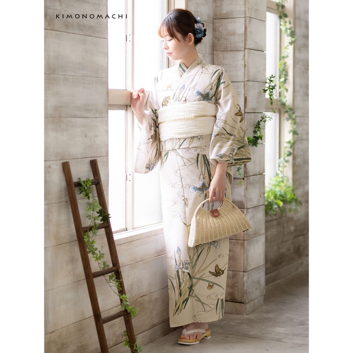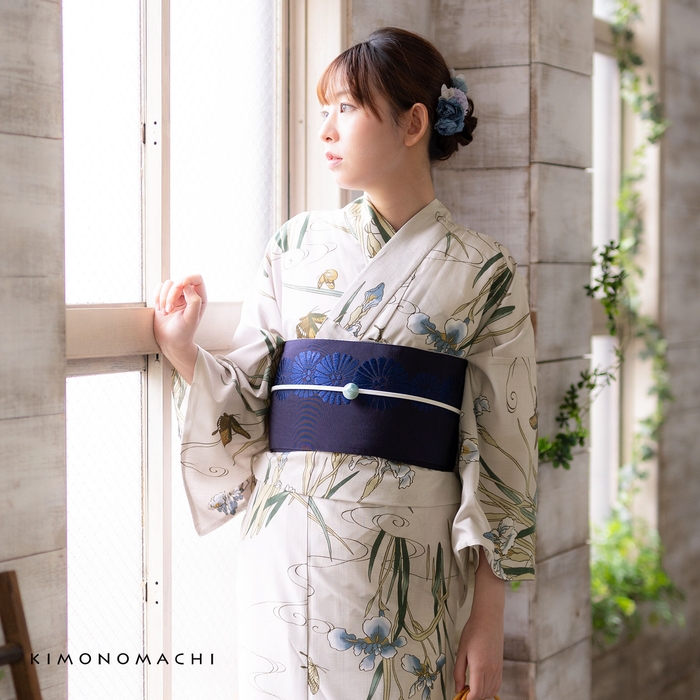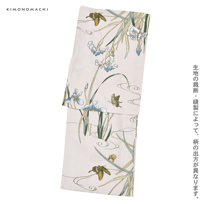 カキツバタ(燕子花/杜若)は古くから日本で愛好され、和歌や屏風絵など芸術作品のモチーフとしても取り上げられています。水辺に咲き、青紫色の美しい花を咲かせます。花びらの付け根に白い筋が入っているのがアヤメや菖蒲との違いですが、浴衣ではデザインですので白以外の挿し色が入っています。