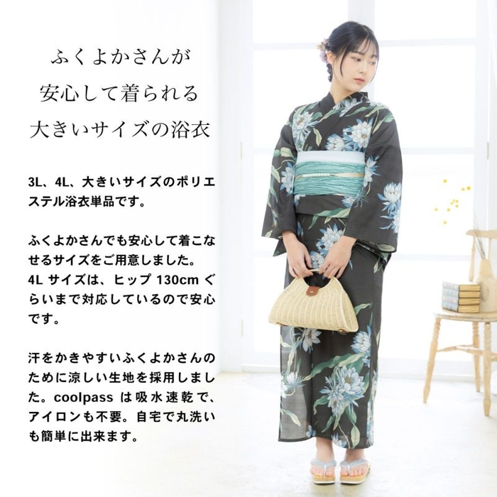 ポリエステル浴衣というと、汗がこもって蒸れやすいというイメージがありますが、吸水性、水分拡散力が高い高機能ポリエステルCoolpassは清涼感と爽快感を感じられる生地です。自宅の洗濯機で洗うことも可能で、洗濯時にもシワになりにくい優れもの。