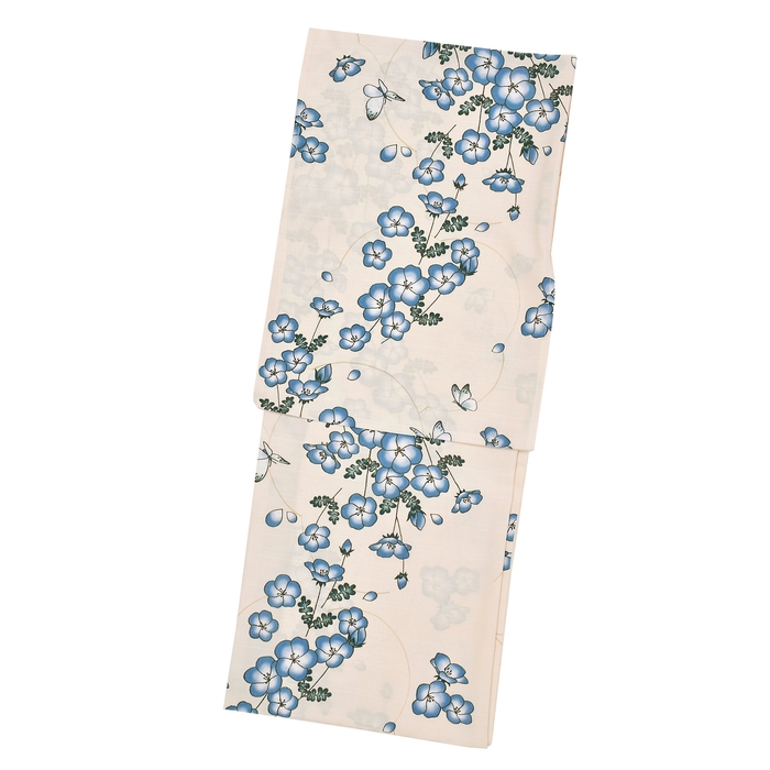 年々、愛好者が増えているネモフィラの花が、大胆な強い柄行ではなくかわいらしい印象となるよう配置され、やはり春に可愛らしい姿を見せるモンシロチョウが合わせられています。