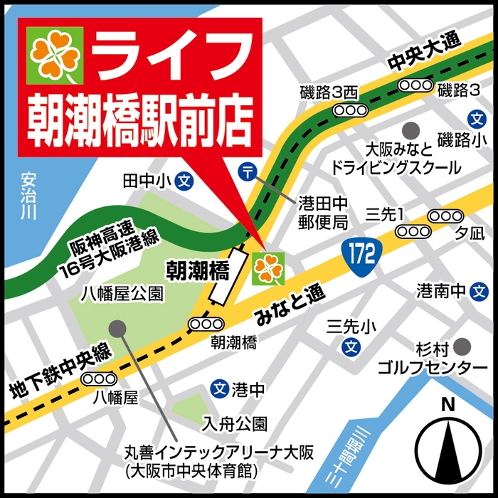 <店 名>「ライフ朝潮橋駅前(あさしおばしえきまえ)店」