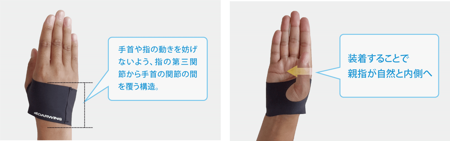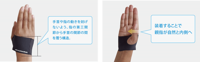 作業の負担をかけにくく、パフォーマンスを効率的に発揮できるといわれている「握る姿勢」に着目して設計。装着することで生地の張力が働き、親指を内側に寄せて正しい作業姿勢に導きます。親指を内側に引き寄せることで手にアーチができるため、作業時に親指の付け根にかかる負担を軽減して握る力をサポートします。