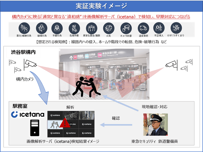 東急セキュリティ株式会社(本社:東京都世田谷区、代表取締役社長:下形 和永、以下「東急セキュリティ」)は東急電鉄株式会社(以下、「東急電鉄」)の協力のもと、半導体・ネットワーク・サイバーセキュリティ・AI/IoTにおけるトータルサービス・ソリューションプロバイダーの株式会社マクニカ(本社:神奈川県横浜市、代表取締役社長:原 一将、以下マクニカ)と協業し、異常やその予兆を防犯カメラ映像から発見する異常検知ソリューションicetana(以下、icetana)を活用した警備オペレーションの実証実験(以下「本実証実験」)を東急電鉄渋谷駅(東横線・田園都市線)において、2022年7月1日より開始いたします。