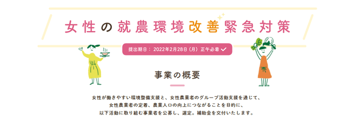 株式会社マイファーム(京都府京都市、代表取締役:⻄辻 ⼀真)は、農林水産省 令和3年度補正事業「女性の就農環境改善緊急対策事業」の実施事業者として採択を受け、2022年2月1日(火)より事業の活用を希望する事業者の公募を開始いたしました。